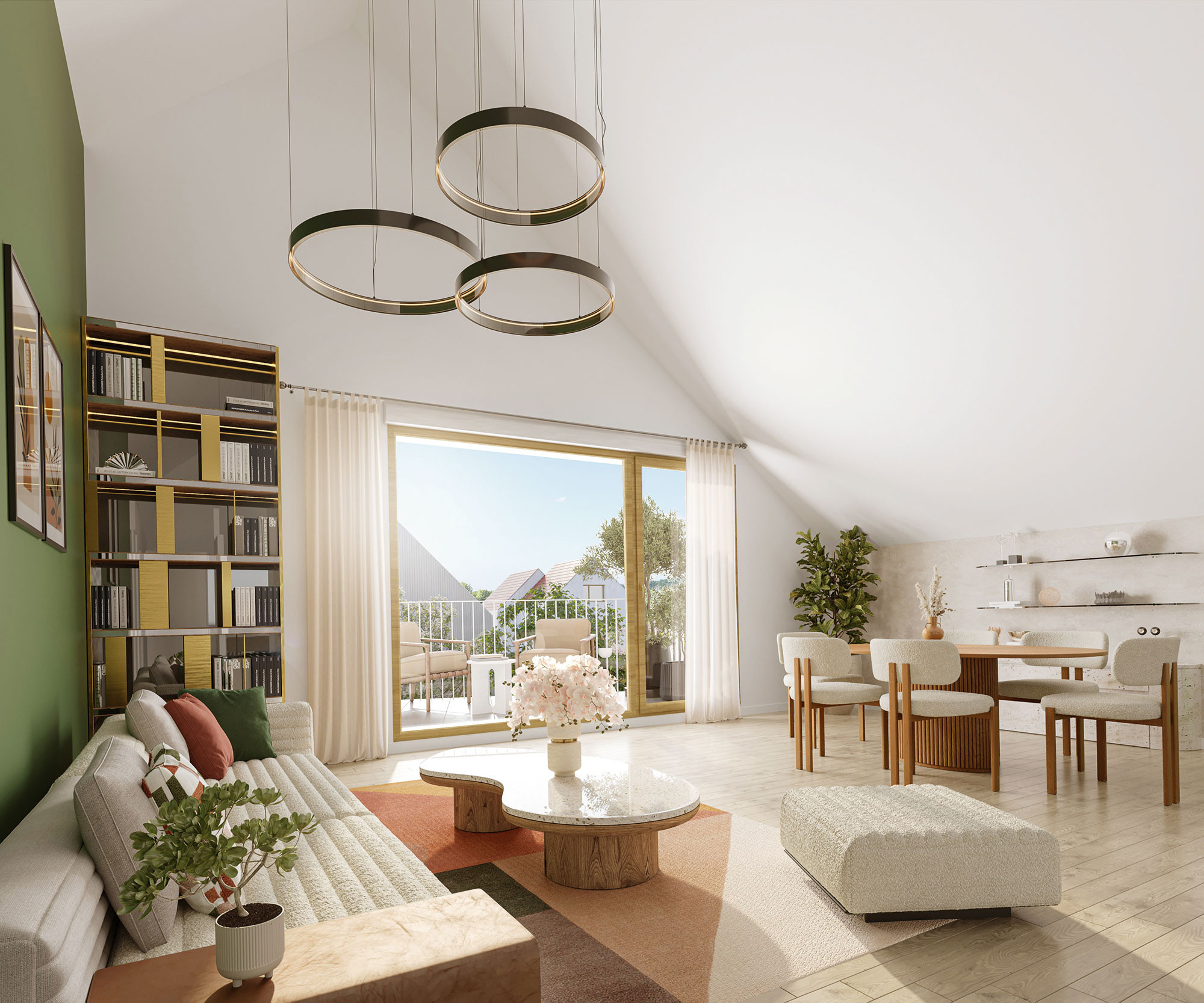 Pensés pour offrir confort et intimité, les appartements sont intégrés dans un bâtiment à l’allure de maison, avec seulement deux ou trois logements par palier. Leur conception bioclimatique privilégie des espaces lumineux et bien agencés, mettant en valeur des volumes généreux. Certains bénéficient de hauteurs sous plafond remarquables, allant jusqu'à 4,8 mètres, accentuant la sensation d’espace et de liberté.